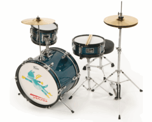 - Komplettes Set: 16″x11″ Bass Drum, 8″x5″ Tom, 10″x4″ Snare, Stative, Becken, Hocker, Sticks.