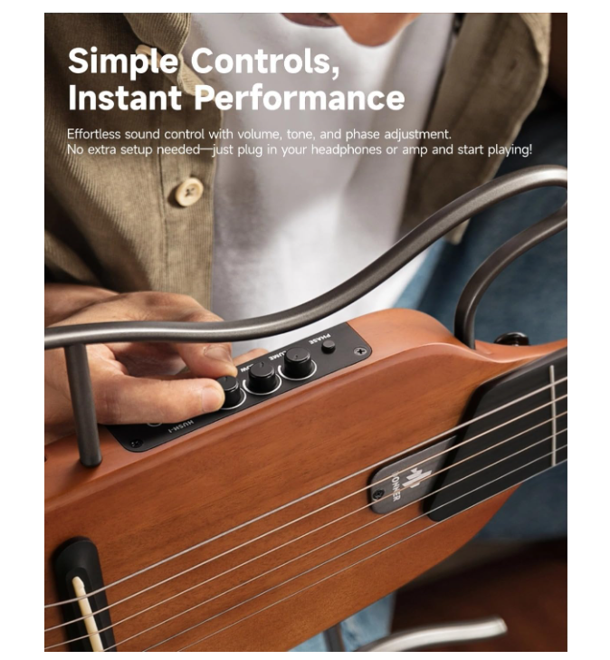 Im Kopfhörermodus erzeugt die Gitarre einen warmen, luftigen Akustikklang, der sich hervorragend zum Üben oder sogar Recording eignet. Der Reverb-Effekt verleiht dem Sound Tiefe und Raum – ein großer Vorteil für Spieler, die unterwegs nicht auf einen angenehmen Klang verzichten wollen.